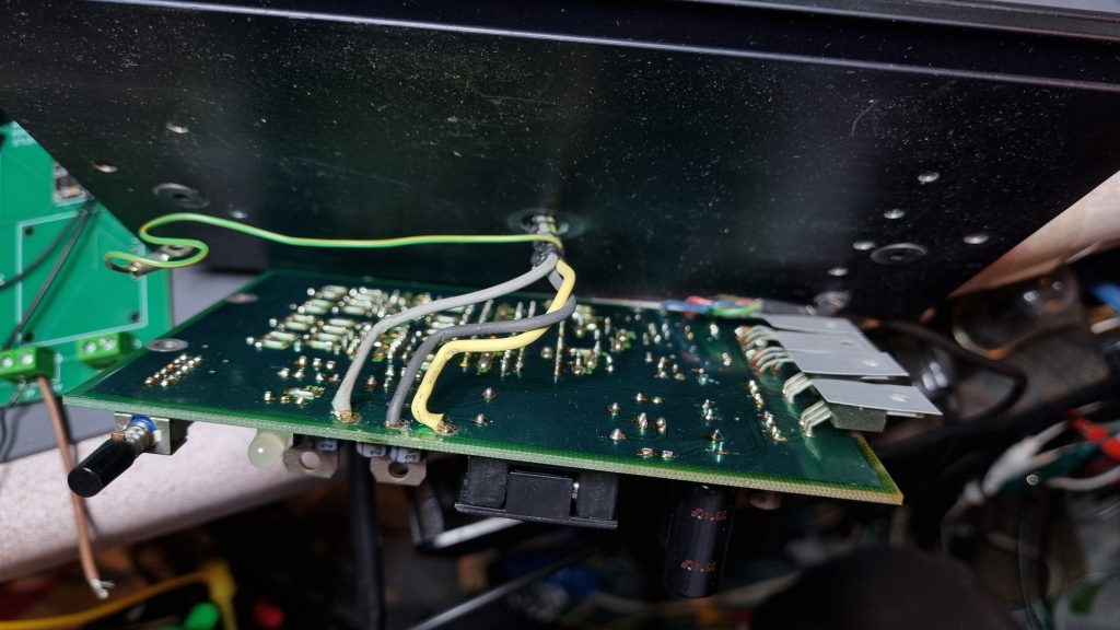 Looked inside and immediately obvious that two capacitors were bulging and dried out so these were replaced temporarily (didn’t get a photo of the dead ones – one measured about 3nF the other about 15uF – should be 470uF!) but then noticed that all the 22uF ones looked bad too, first the board needed releasing so easiest is to desolder the three wires from the transformer:
