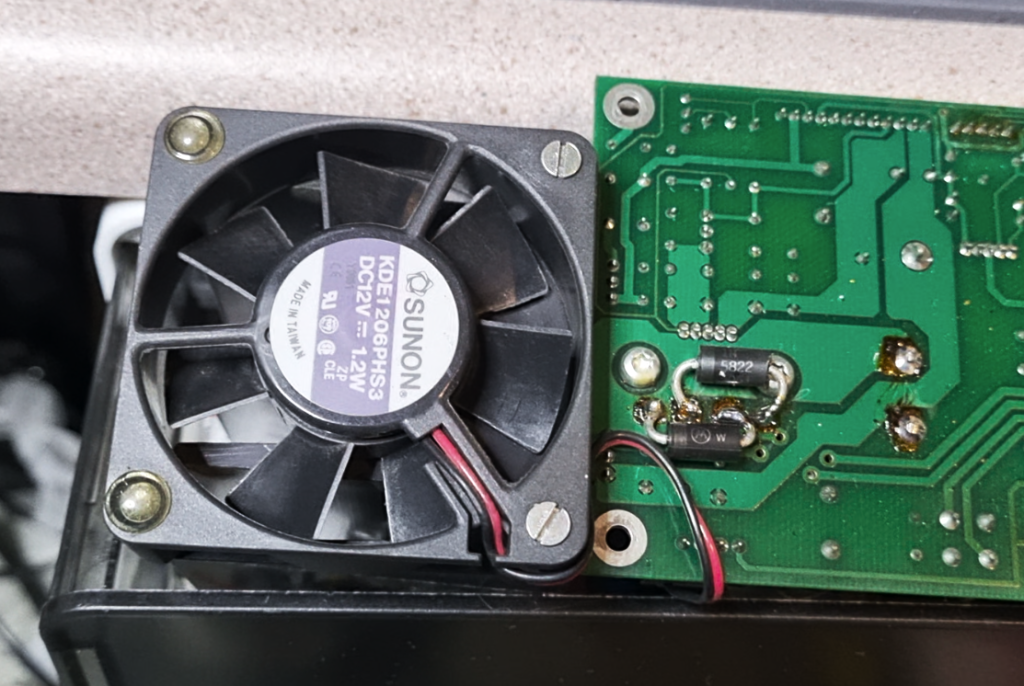 Then found the cooling fan was a bit noisy (low rumble/growl), so the PSU board was removed to get access. The fan was quite dirty too.