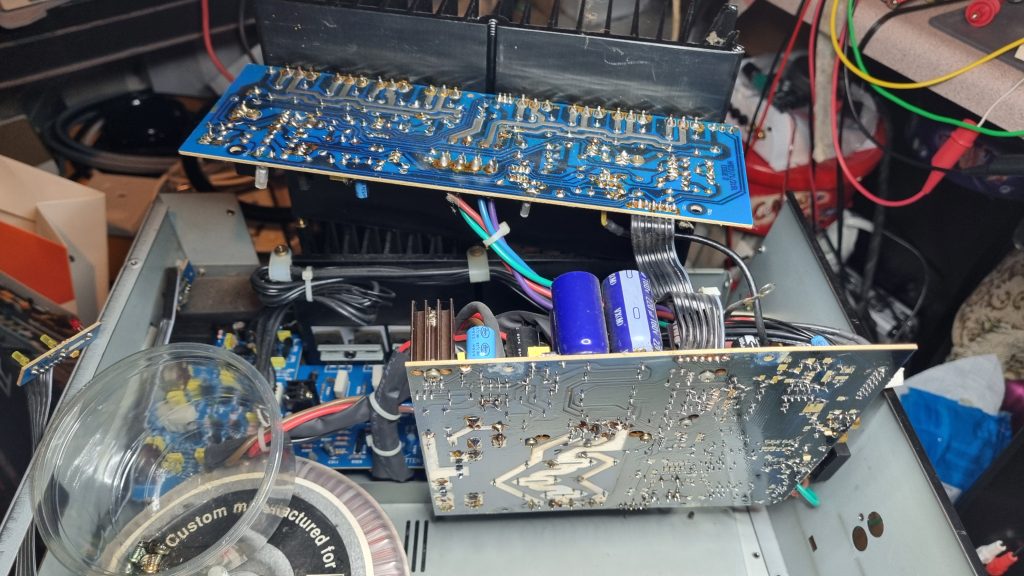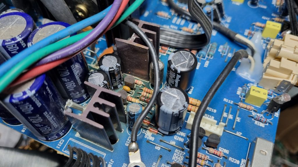 Discovered some resistors (R205, R208) were loose, indicating dry joints, so had to remove board to investigate further, this meant disassembly of all boards as unfortunately a prior repair had removed one of the connectors from the RH channel amp board. Also spotted a couple of sick looking capacitors in the vicinity of all that heat.