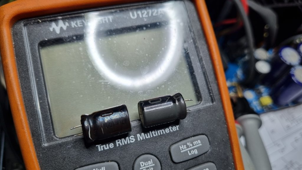 Two very dry caps removed (blackened and shriveled), 100V 47uF – had some 63V in stock but needed to order 100V versions: