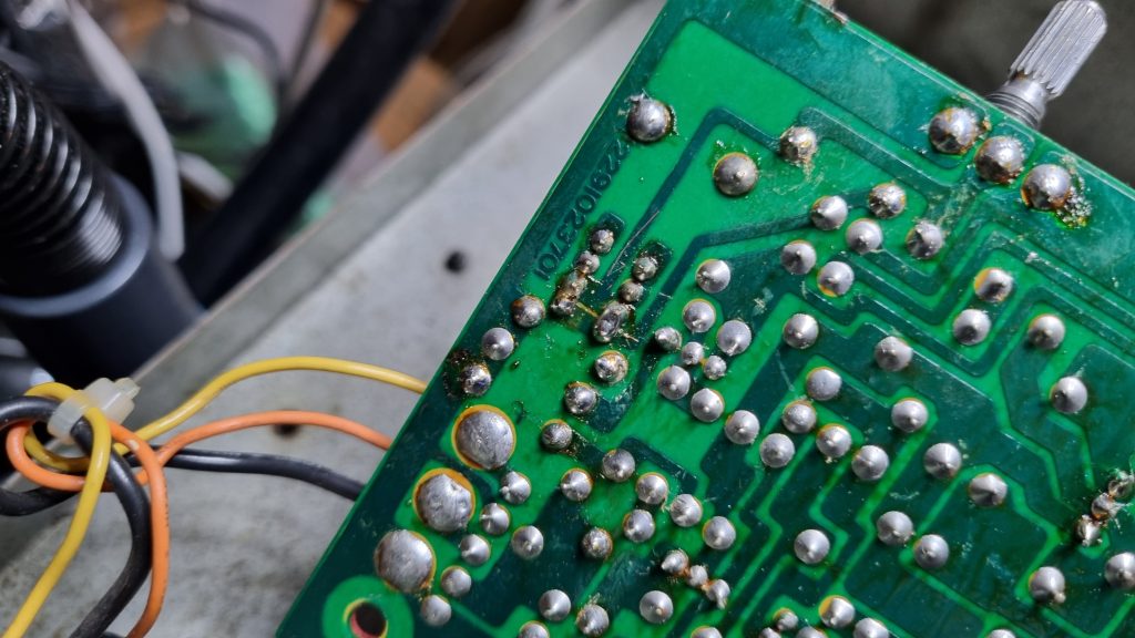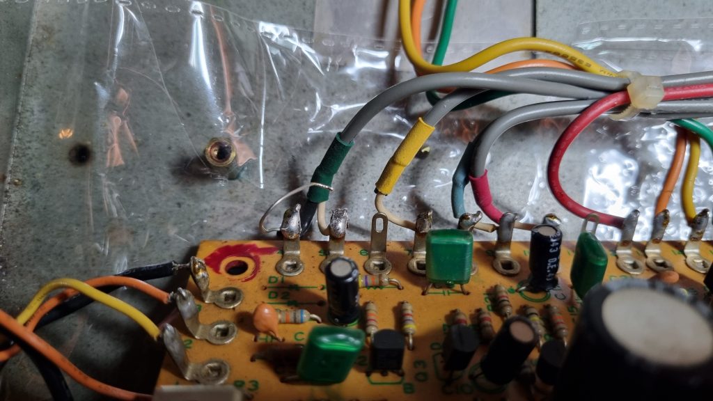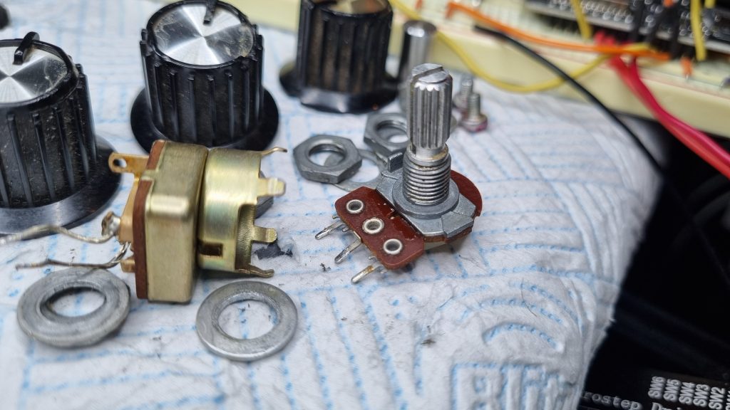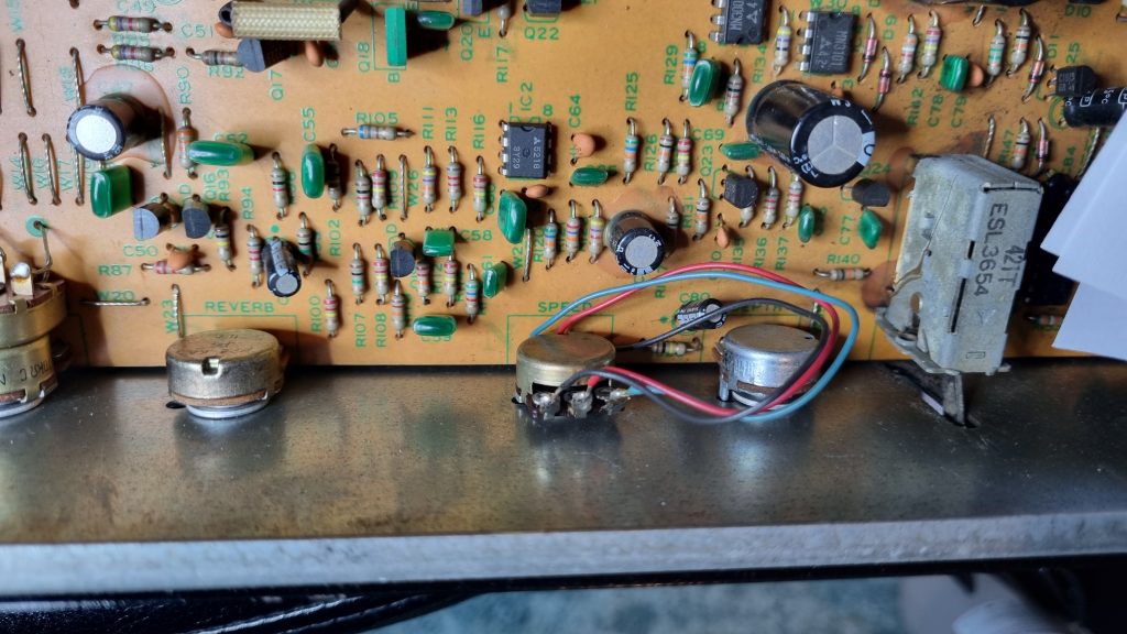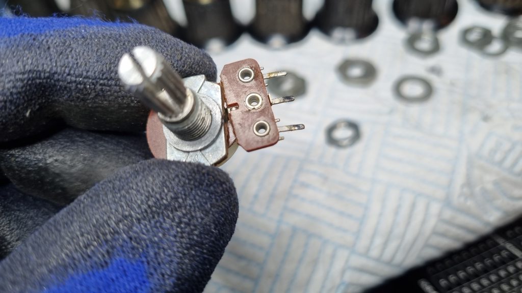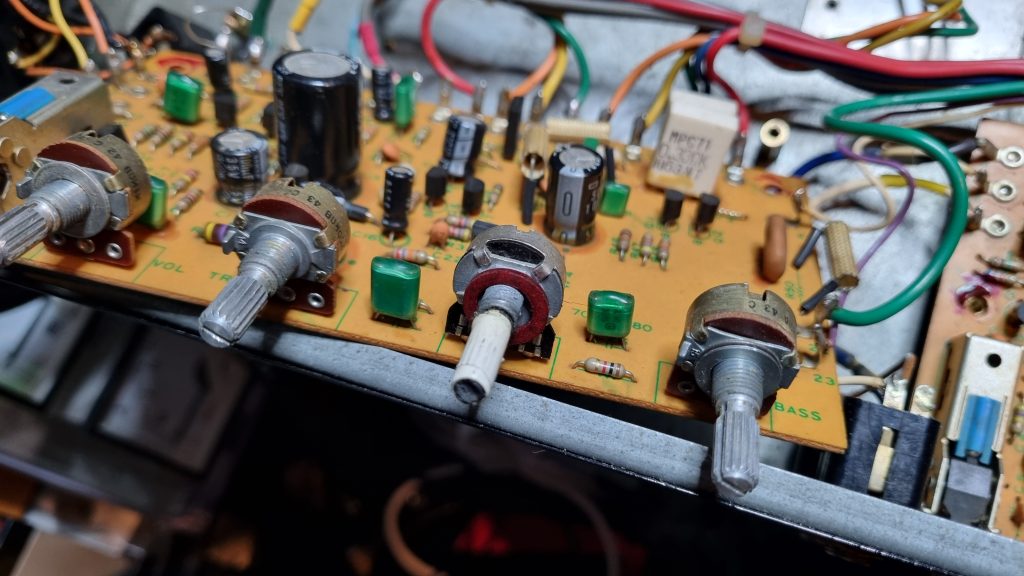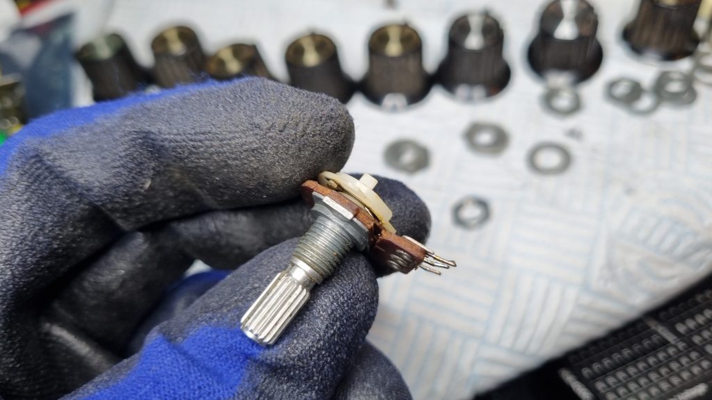 This was also replaced with the proper PCB mount version, and the earlier found pot was replaced with the correct diameter shaft (the one in there had been taped up to try to hold on to the knob! – last photo before replacement):