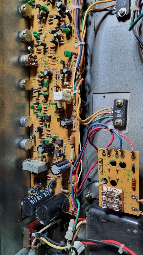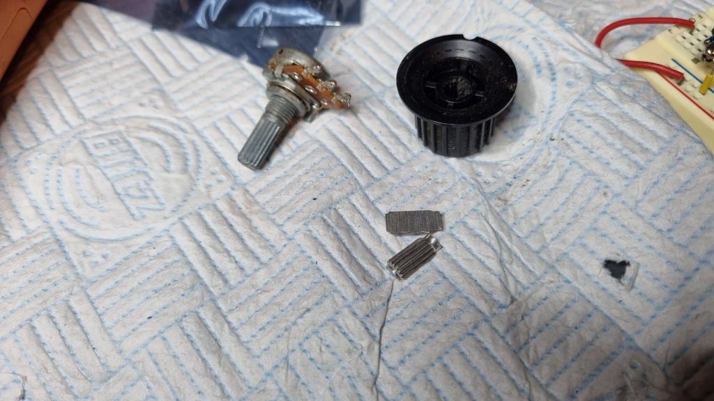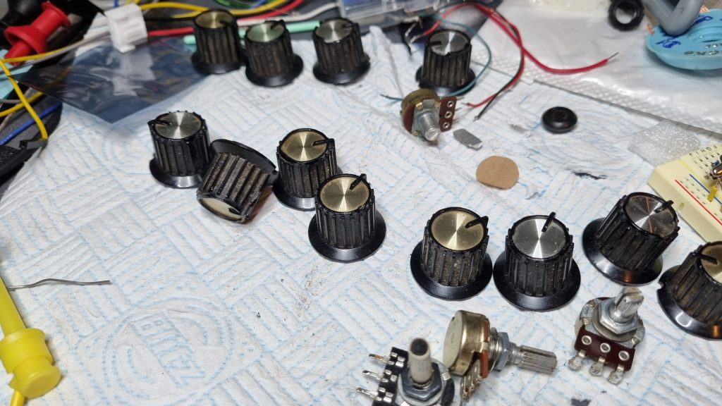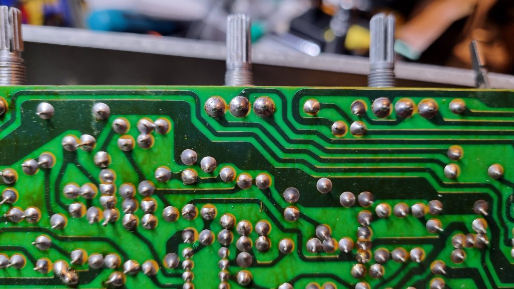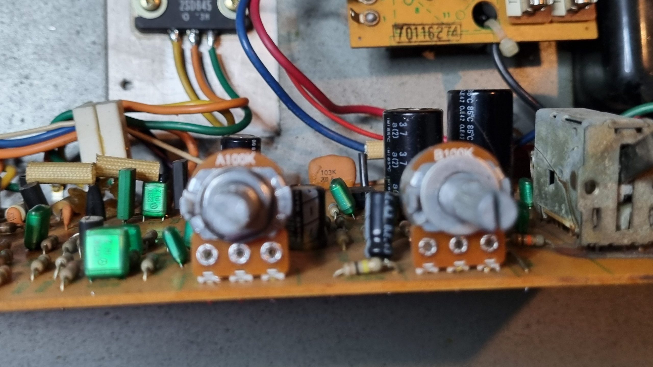 This was also replaced with the proper PCB mount version, and the earlier found pot was replaced with the correct diameter shaft (the one in there had been taped up to try to hold on to the knob! – last photo before replacement):