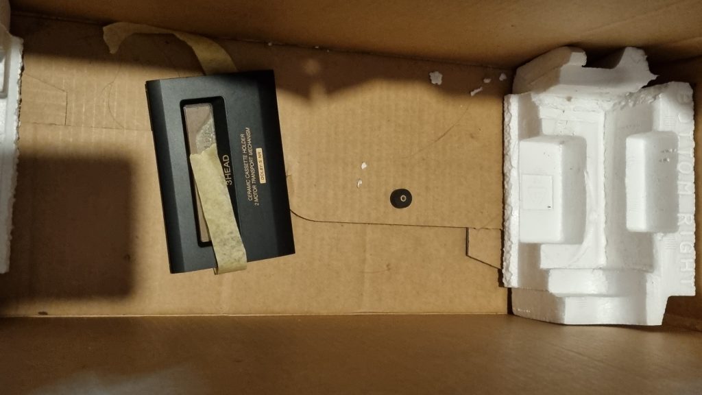 This cassette deck was stored in an attic for many years. Unfortunately no longer worked when tried, couldn’t open door etc. Saw pinch roller at the bottom of the box and luckily the retaining pin was floating around inside the unit.