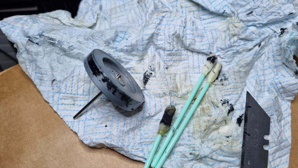 This has to be one of the most vile substances known to mankind 😖😂 – it seems to be a bit like soft road tar, sticky, black and the slightest microscopic bit will turn anything black including cleaning swabs, so truly takes ages to clean up with plenty of solvent and IPA, the trick is to remove the bulk of it first.